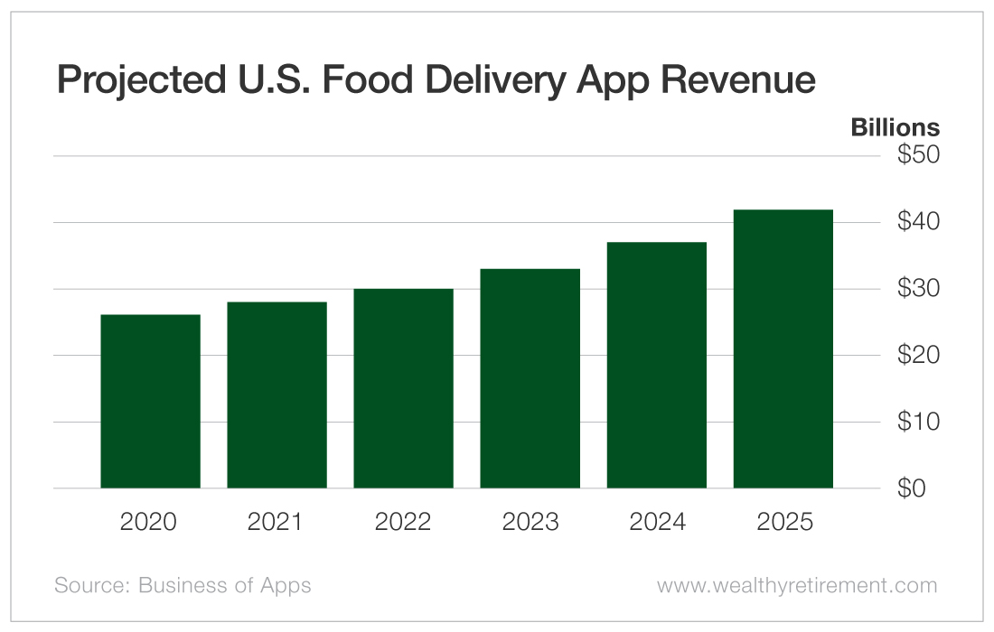 Take the following chart, for example. Revenue for U.S. food delivery apps is expected to keep rising steadily from now through 2025, growing by more than $10 billion.