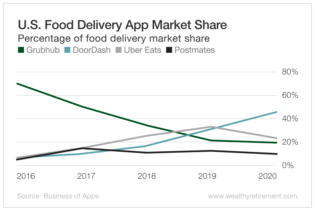 One clue comes from market share. As new rivals have emerged and grown, industry leader Grubhub has gradually lost its monopoly on the U.S. delivery niche, while DoorDash has greedily scooped up more and more of the market.